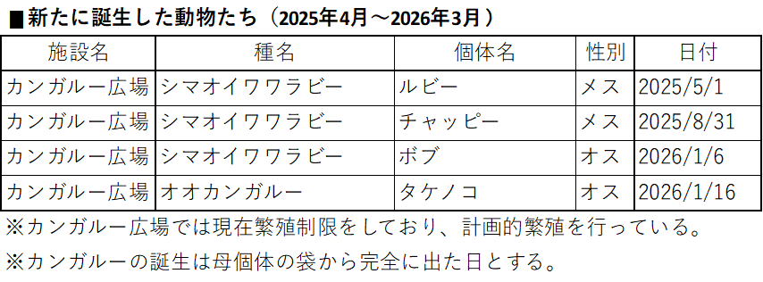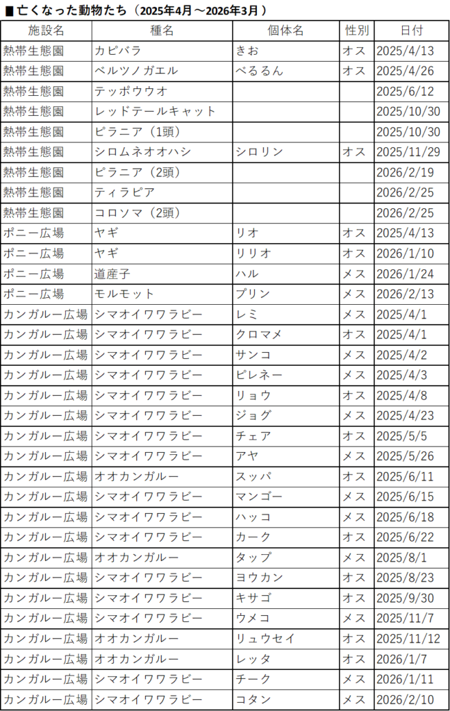 令和7年4月から令和8年2月末までの各施設における動物たちの誕生、新規導入、移動、死亡の状況をお知らせいたします。