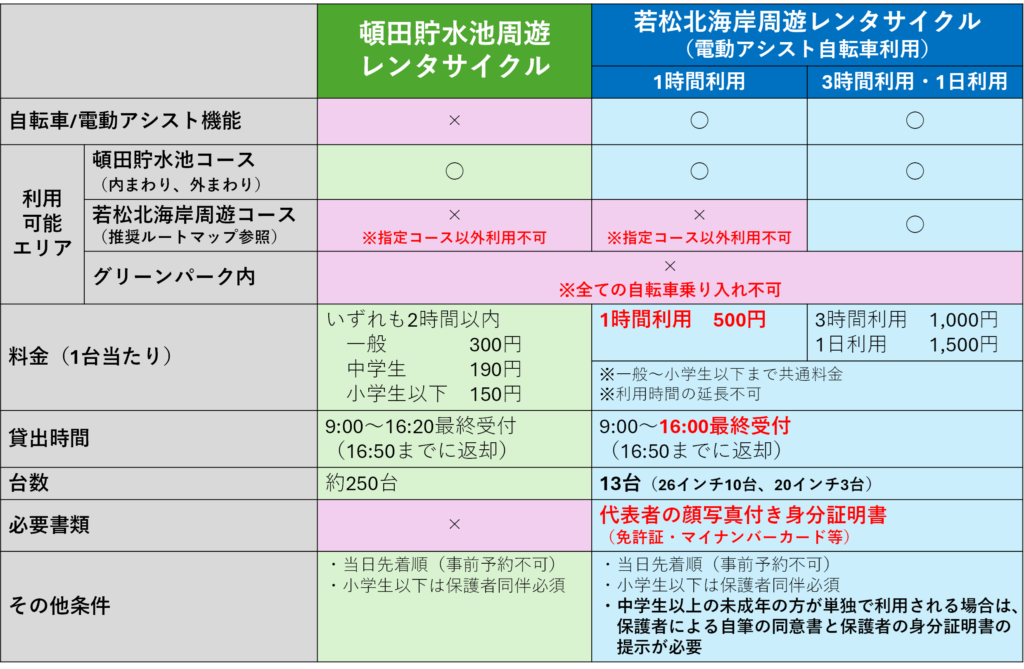 若松北海岸周遊コース(※推奨ルートマップ参照)に出られるのは、新たに導入する電動アシスト自転車(3時間利用・1日利用)のみ です。従来の自転車ならびに1時間利用は、頓田貯水池コース(外まわり・内まわり)専用となりますので、ご注意ください。