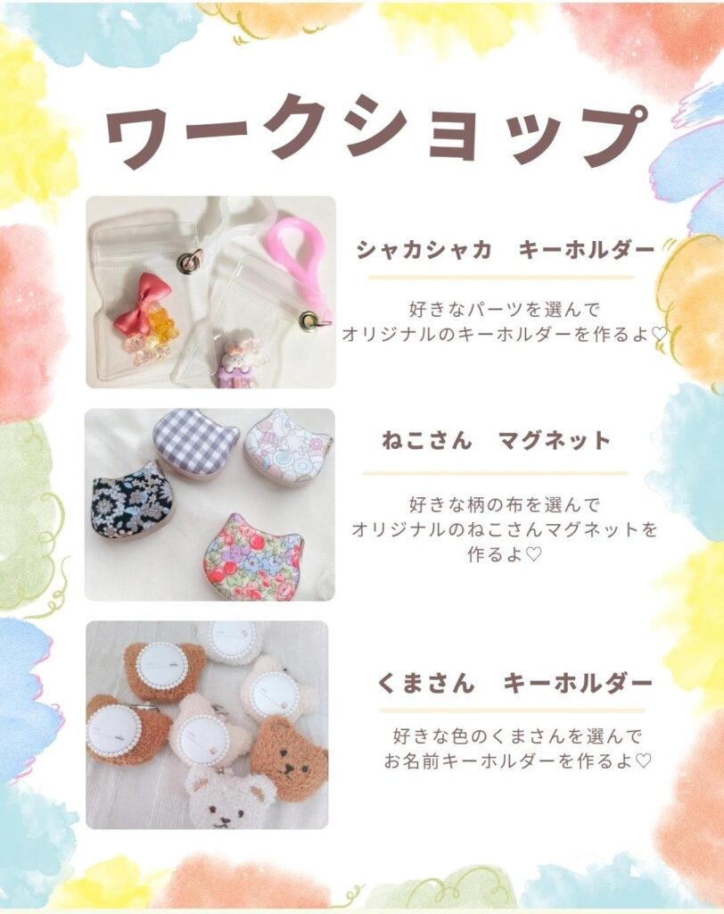 マグネット作り、くまさんキーホルダーなどのワークショップの他、