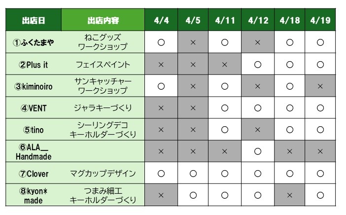 ■4月の出店予定者(○印がついている店舗が出店)
