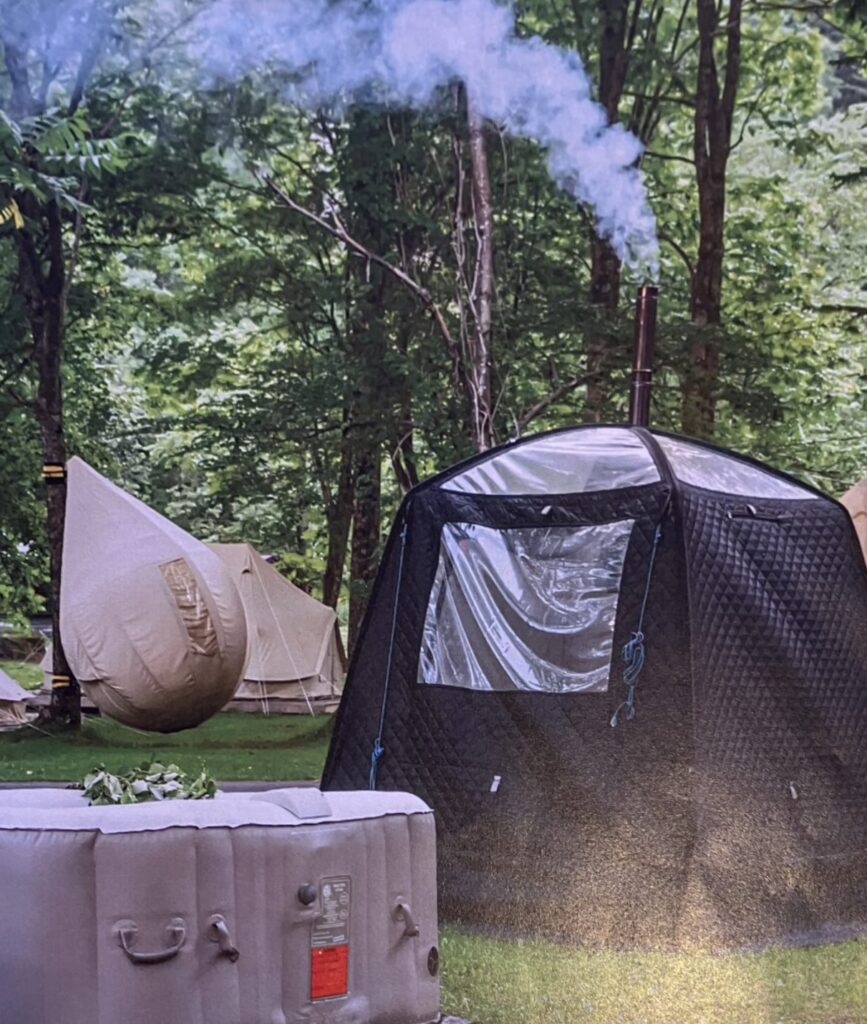 おすすめは、手ぶらで気軽にキャンプが楽しめる「手ぶらde楽キャンサイト」。ギアはスノーピーク社製のアイテムを完備しています。今回はこの「手ぶらde楽キャンサイト」をそのまま展示!快適なテント泊の雰囲気をぜひ体験してください。
