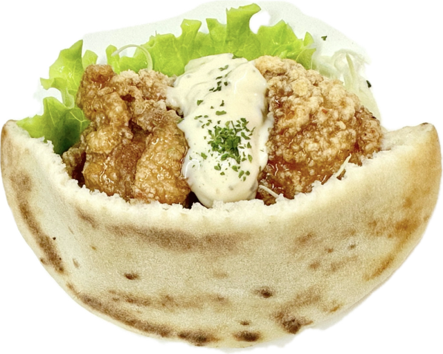 唐揚げ屋の作るチキン南蛮に卵たっぷりの自家製タルタルソースをかけてサラダと一緒にピタパンに挟みました。是非一度ご賞味ください。