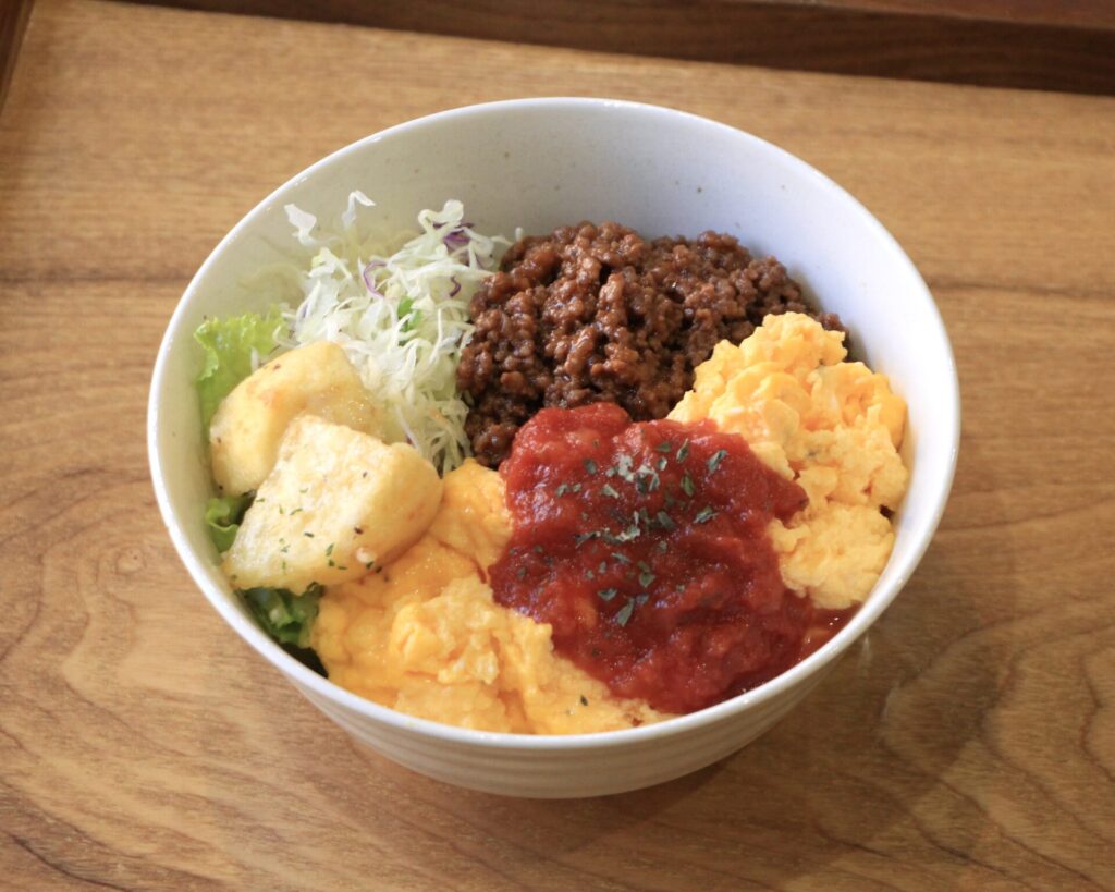 旨みたっぷりの洋風そぼろにバター香るスクランブルエッグをふんわり合わせ、自家製トマトソースで仕上げた満足感たっぷりの一杯。ご飯が進む洋風そぼろ丼です。