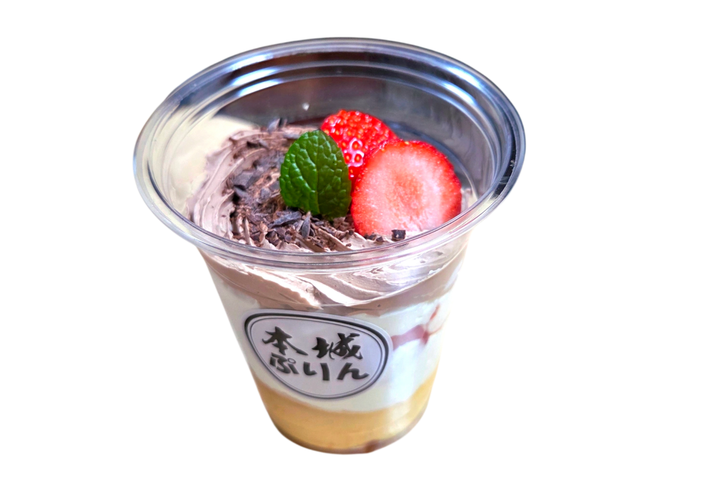 本城ぷりん、生クリーム、苺、生チョコクリームのマリアージュをお楽しみ下さい。