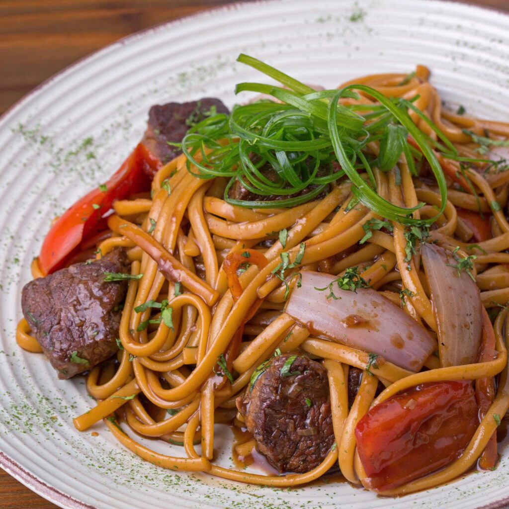 タジャリン・サルタードはペルー料理で、牛肉をトマトや玉ねぎと一緒に中華鍋で焼き、さまざまな調味料で特別な風味を出し、お客様のために一つ一つ調理されるとてもおいしい料理です。