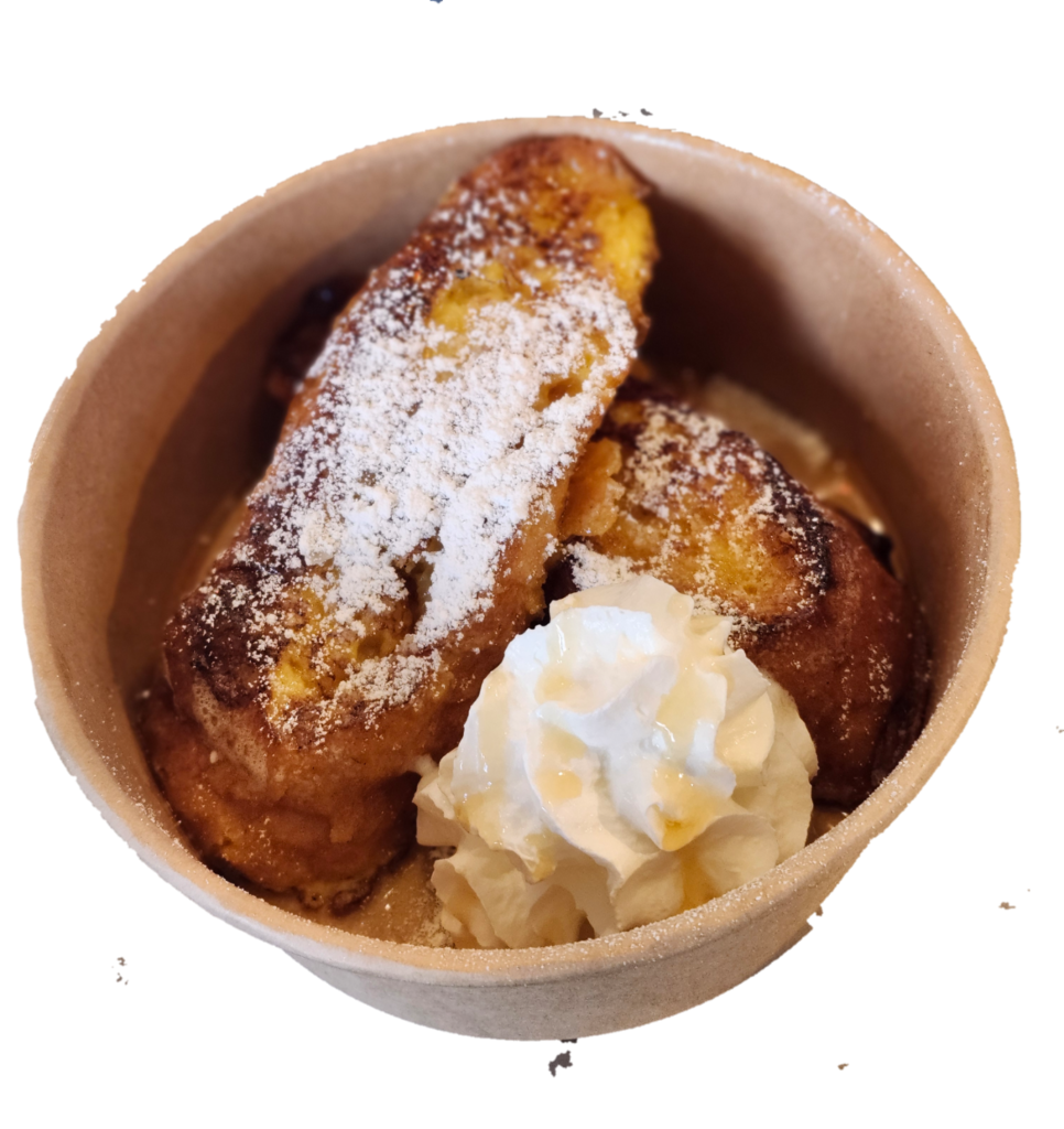 1晩漬け込んだトーストをバターで焼き、外はカリッと中はふんわりトロトロぷりんのような食感に仕上げました。