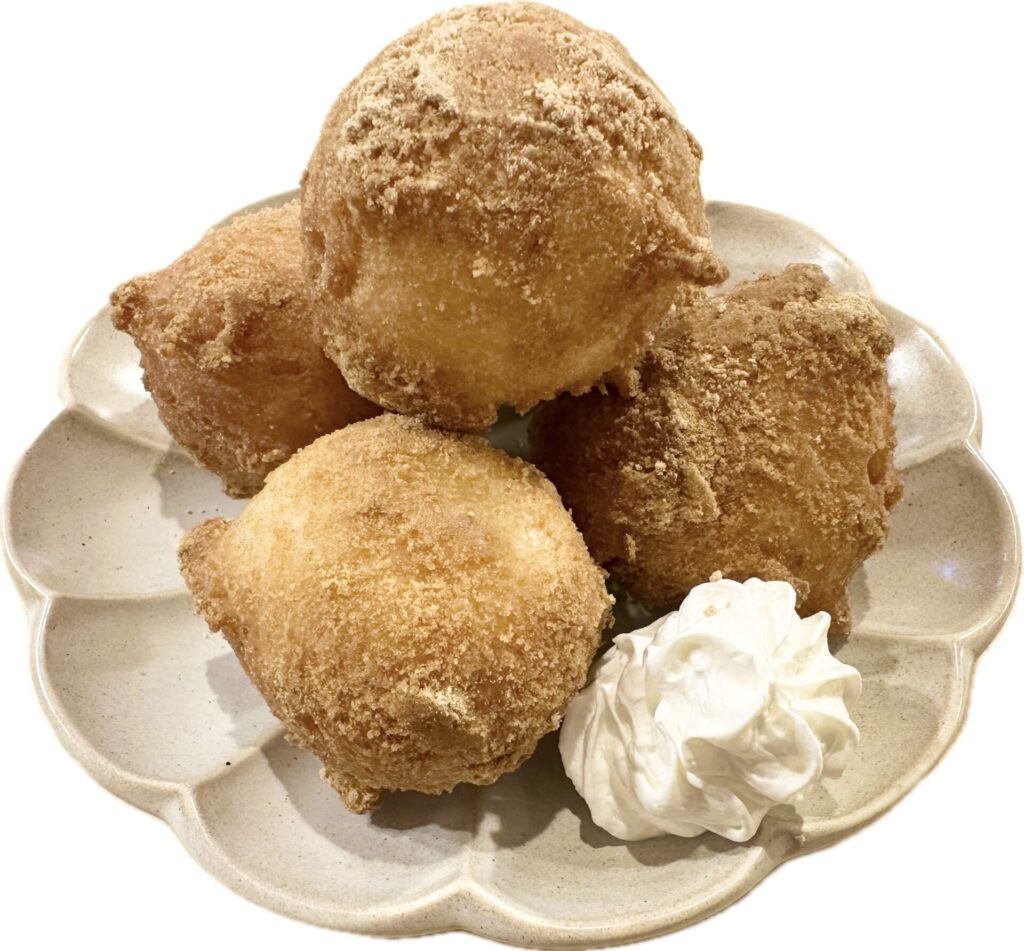 絹ごし豆腐を使ってなめらかでフワフワな揚げたてのドーナツです。きなこをまぶしてますが、そのままでももちろん美味しいです。甘さも控えめなのでホイップクリームと一緒にお召し上がり下さい。