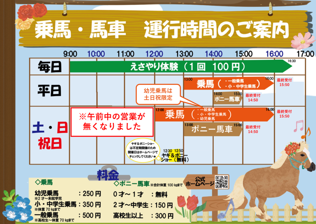 乗馬 (体重70kg以下) | 平日 13:00~16:00(15:50最終受付) ※幼児乗馬(2歳~未就学児対象)は休止中 土・日・祝日 12:00~16:00(15:50最終受付) |