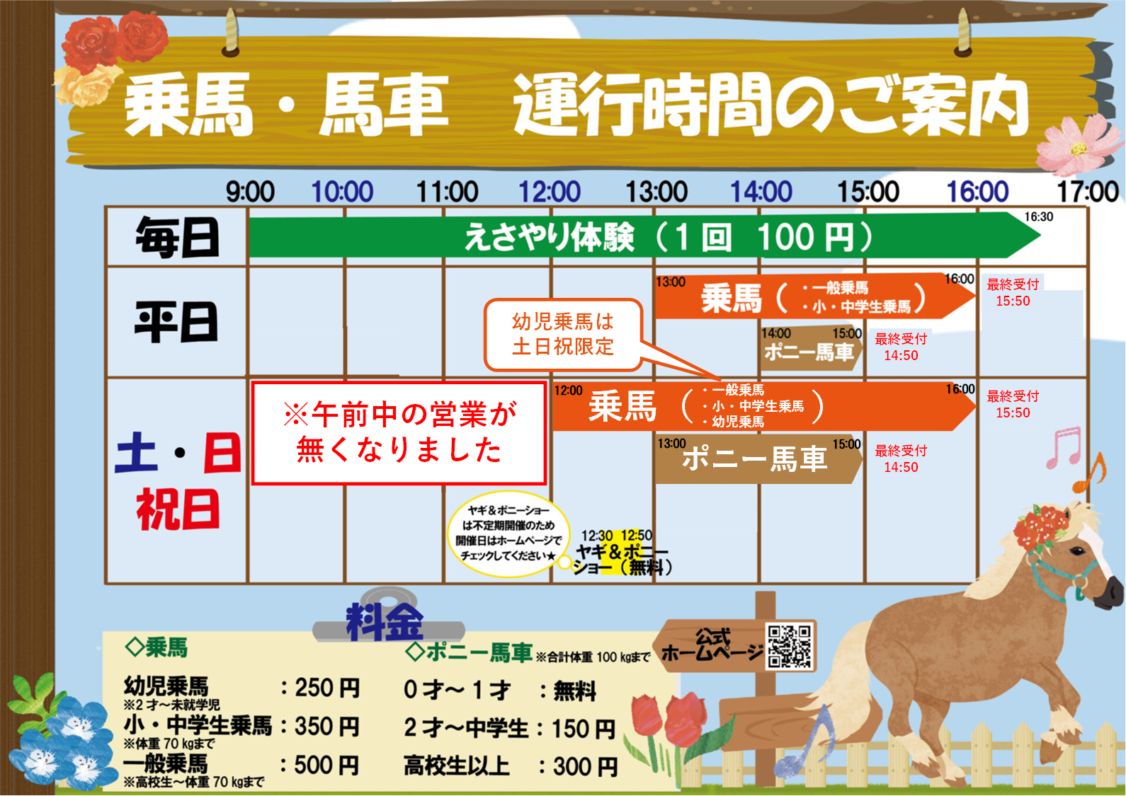 ポニー馬車 | 平日 14:00~15:00(14:50最終受付) 土・日・祝日 13:00~15:00(14:50最終受付) |