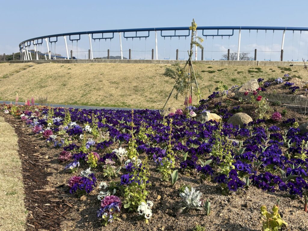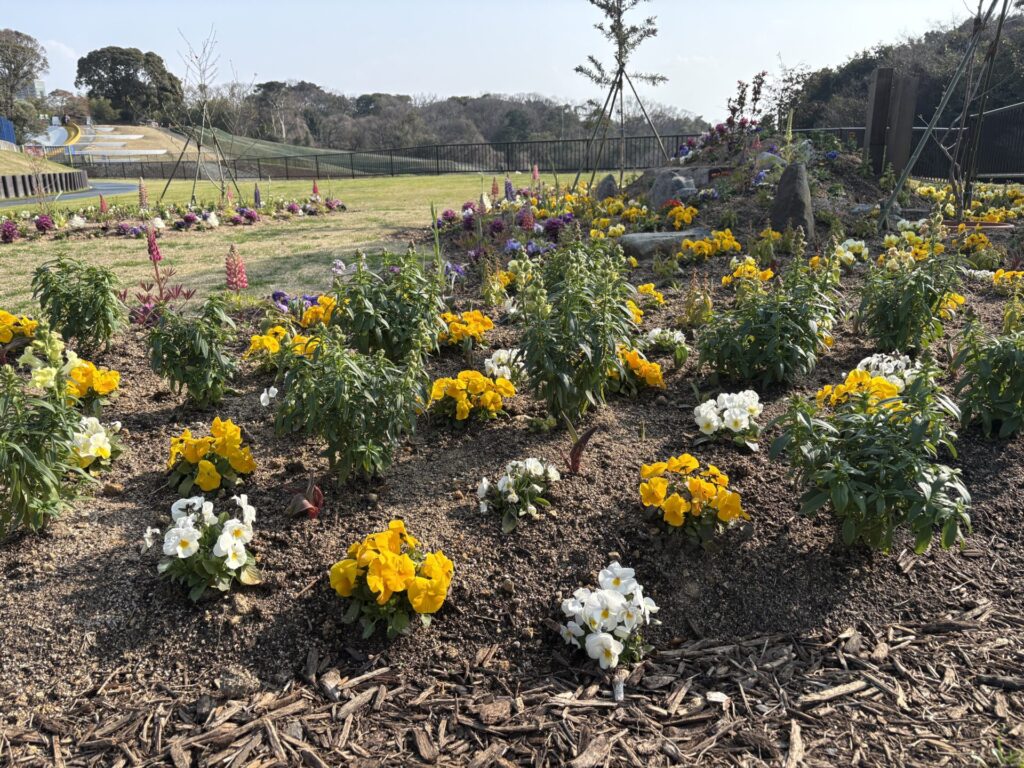 現在はパンジーが見ごろを迎えており、色とりどりの花が花壇を華やかに彩っています。