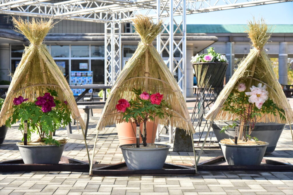 白野江植物公園より、同園の冬の風物詩である「冬牡丹」3鉢(島大臣・向陽・花恵比寿)がグリーンパークにやってきました!
