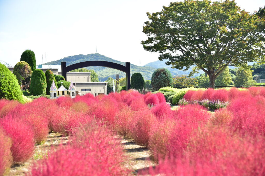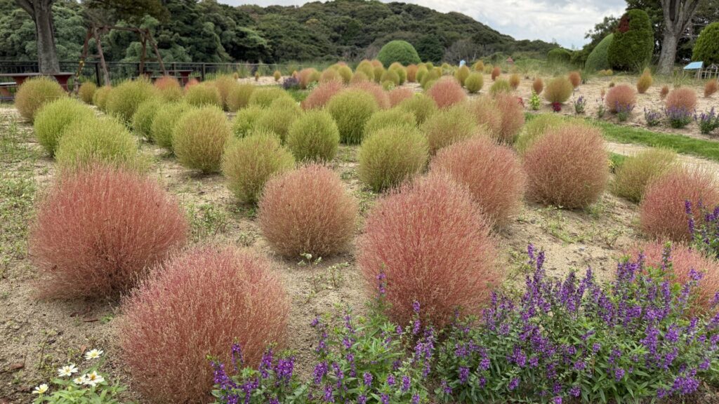 ふわふわと丸いシルエットのコキアは、ライムグリーンから赤へと色を変える姿が魅力です。秋のグリーンパークならではの限定風景を、ぜひご覧ください。