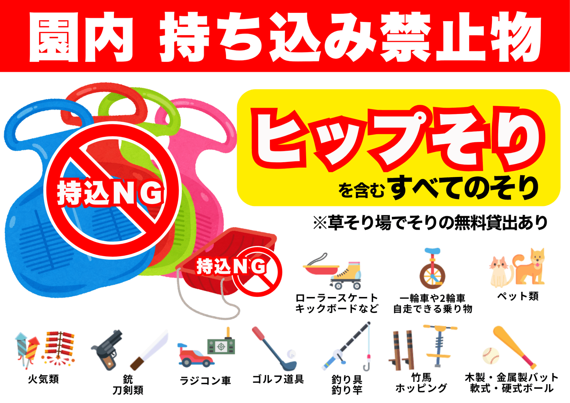 園内では、お客様の安全確保のため、【持ち込み禁止品】を定めております。